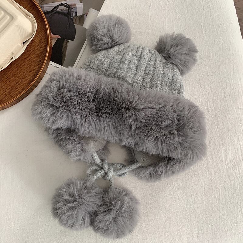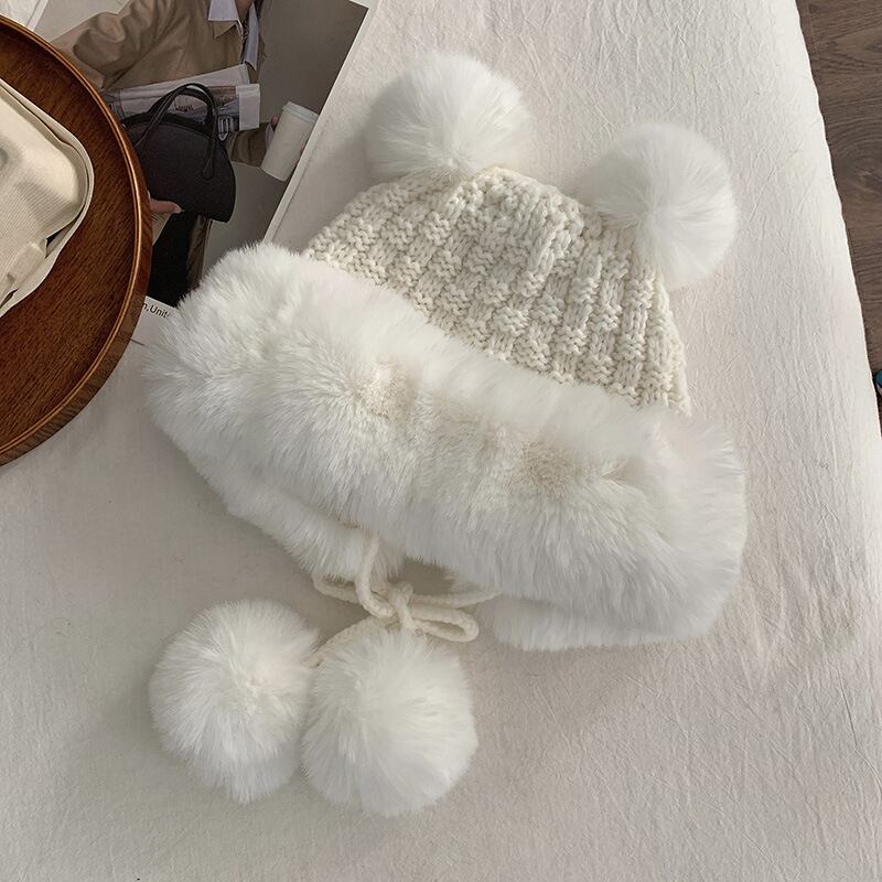ラインキャップレディース冬かわいいボールニット帽秋冬暖かいベルベット耳保護雷鋒帽子128
