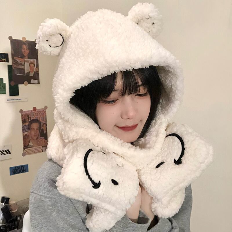 クマのベルベットの帽子とスカーフワンピースのの冬のキュートで暖かいスリーピースの耳保護スカーフ128