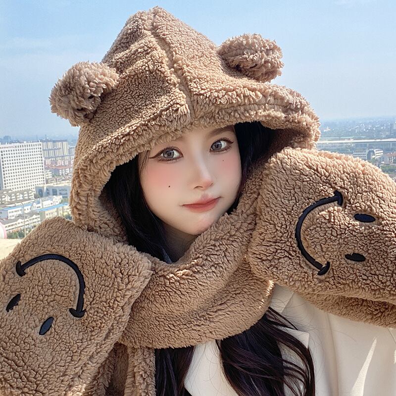 秋と冬のかわいい笑顔のクマ暖かい帽子のスカーフワンピースベルベット手袋スリーピース耐寒性サイクリングキャップ128