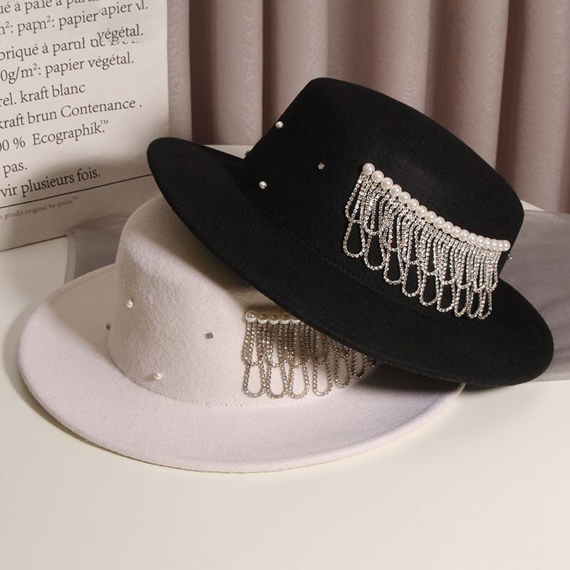 秋と冬の羊フラットシルクハットパールラインストーンフリンジビッグブリムハットジャズハット128