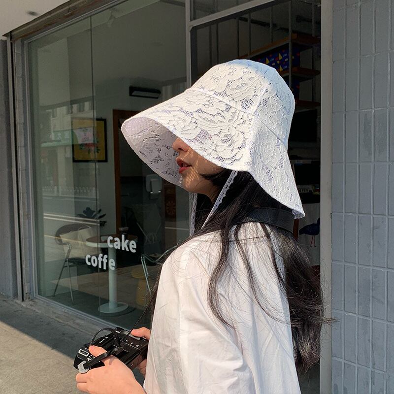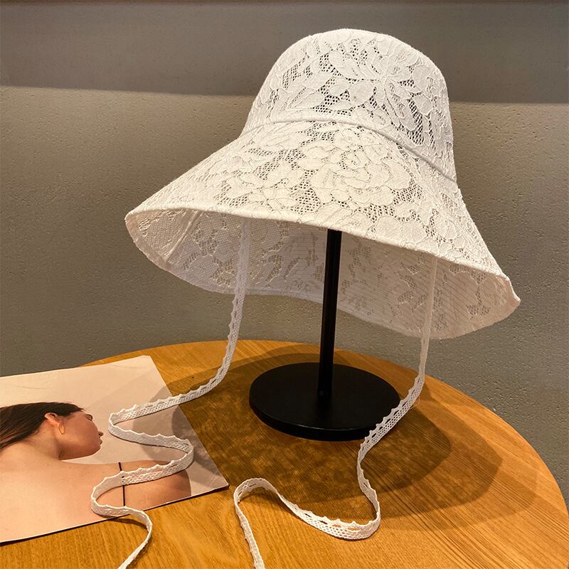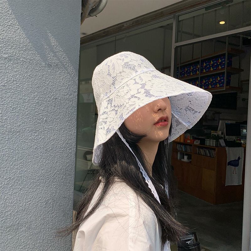 白いレースの漁師の帽子の初春と夏の大きな頭囲通気性のある大きな軒の日焼け止めロープ付きの盆地の帽子129