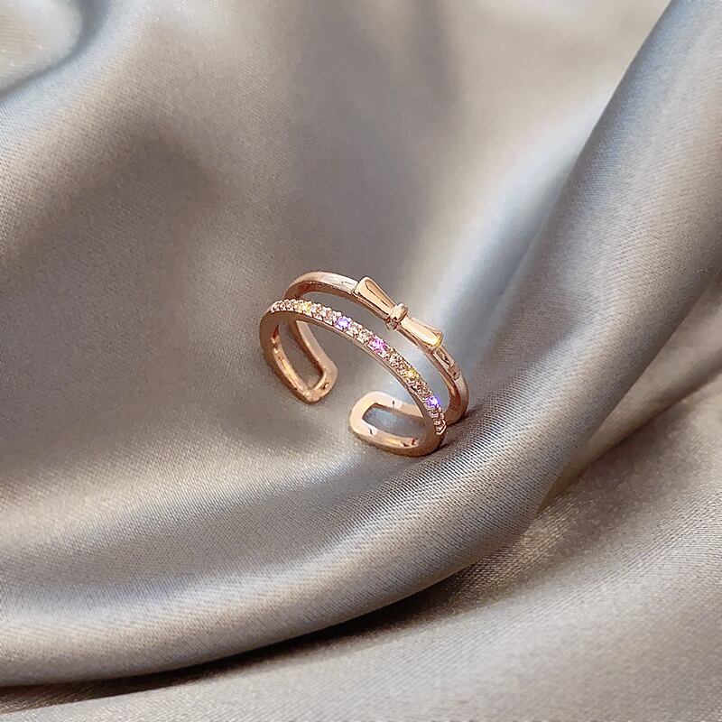 ボウノットダブルレイヤーマイクロインレイローズゴールドリングメスシックインデックスフィンガーリングフローリングSXSSXS