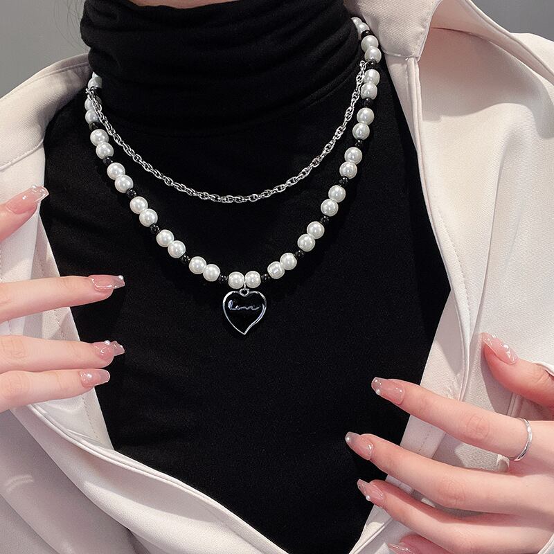チタンスチールブラックとホワイトパールステッチネックレス女性デザインブラックヒップホップダブルレイヤー鎖骨チェーンXHX