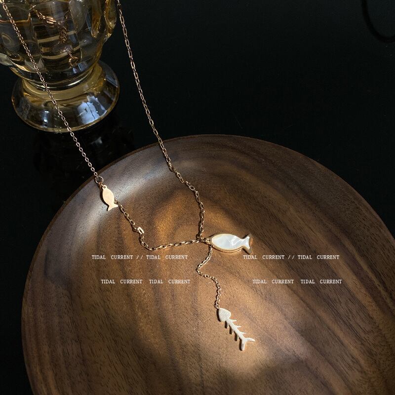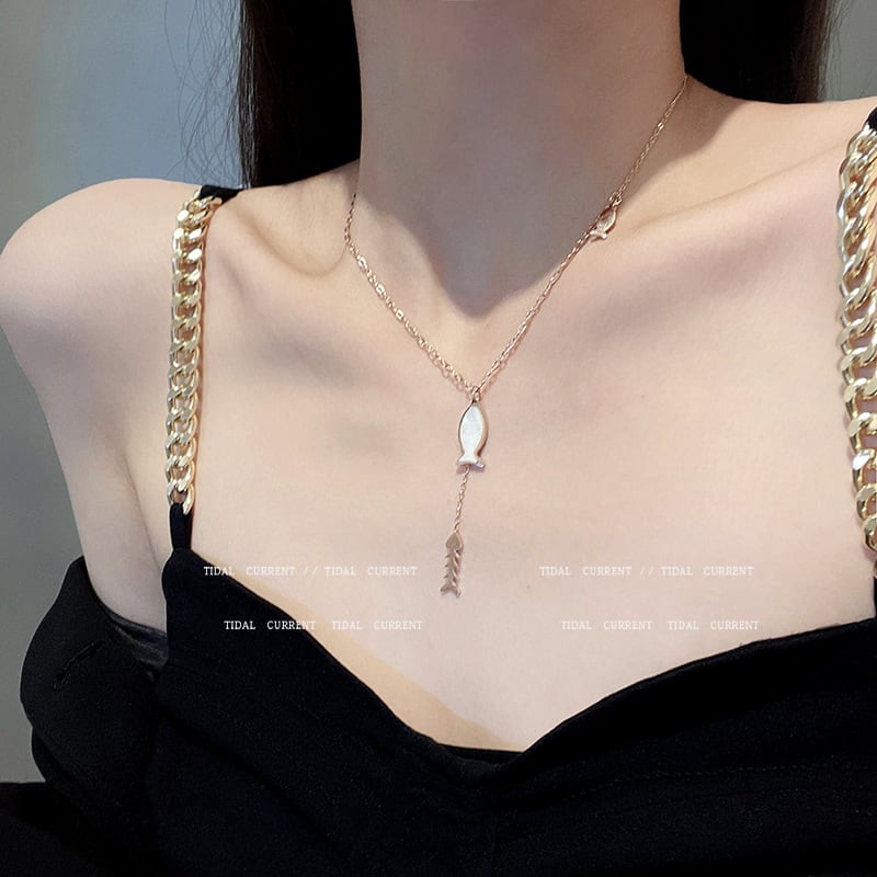 チタンスチールK18ゴールドローズゴールドネックレスメスフィッシュペンダント鎖骨チェーンXHX