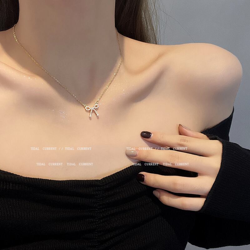 チタンスチールネックレス女性用コールド鎖骨チェーン高品質の蝶結びパールペンダントXHX