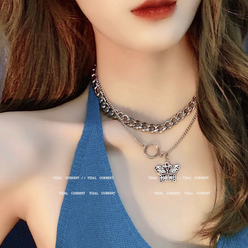 フロスティダブルレイヤーチタンスチールネックレス女性ヒップホップデザイン鎖骨チェーン2022新しいバタフライペンダントXHX