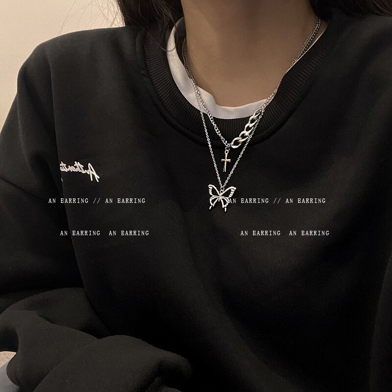 二層バタフライネックレスメスクロスペンダントヒップホップ鎖骨チェーンXHX
