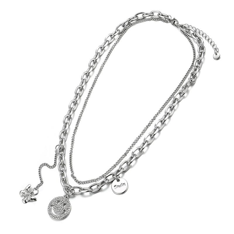 チタンスチールボウノットスマイリーフェイスジルコンネックレス女性ヒップホップウェアセーターチェーンスウィートクールハイエンドダブルレイヤードウェアアクセサリーXHX014015