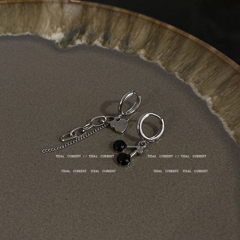 SシルバーニードルブラックチェリーイヤリングピーチハートチェーンイヤリングメスメタルコールドイヤリングイヤリングEHE