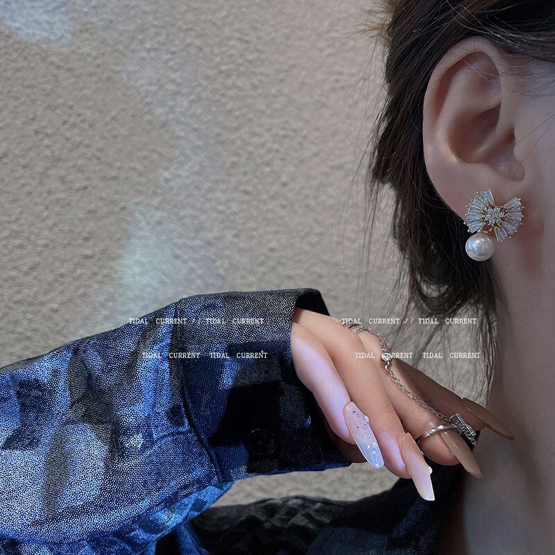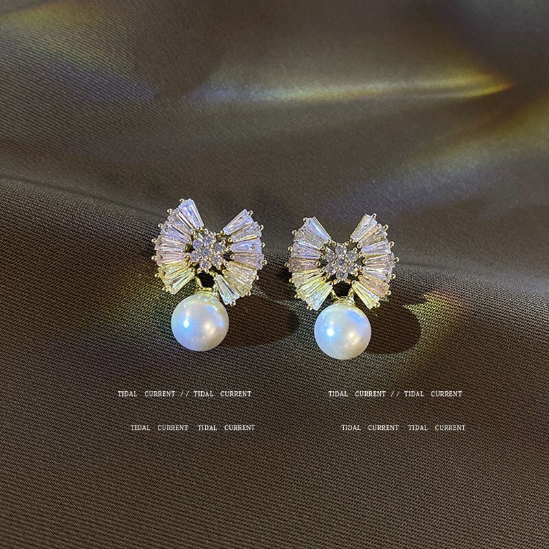 sシルバーニードルボウノットパールイヤリング女性ライトラグジュアリージルコンイヤリングイヤリングイヤリングEHEEHE