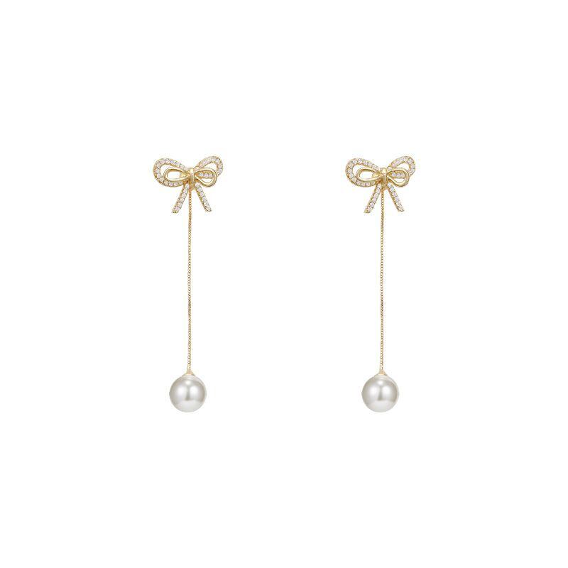SシルバーニードルボウノットパールタッセルイヤリングメスロングイヤリングハイエンドイヤリングEHE