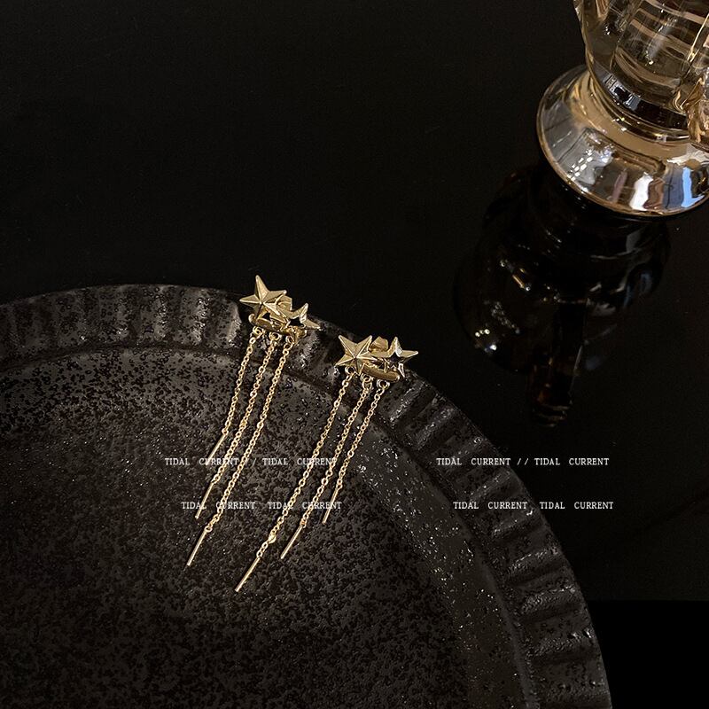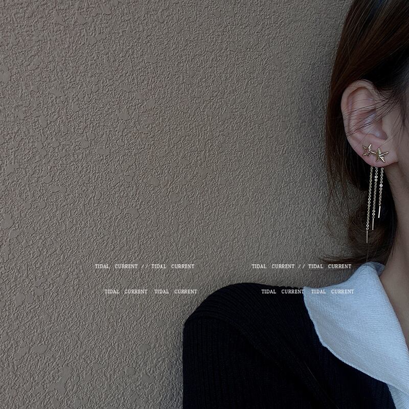 sシルバーニードルロングタッセルピアスメスホロースターピアスEHEEHE