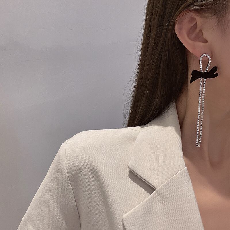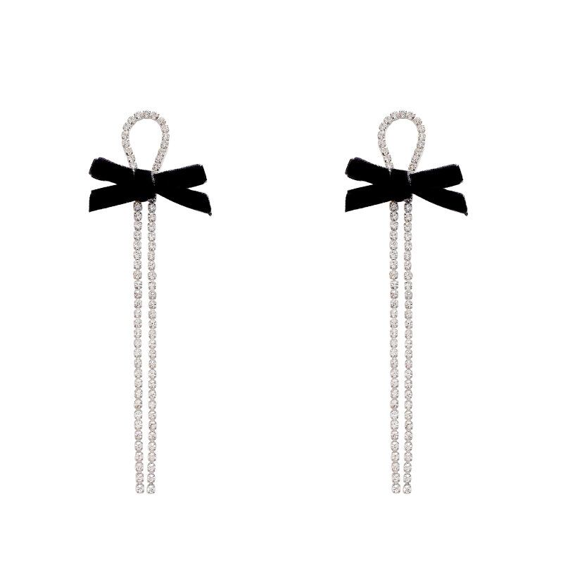 ブラックベルベット蝶結びイヤリング女性ロングタッセルラウンドフェイススリミングイヤリングイヤリングEHEEHE