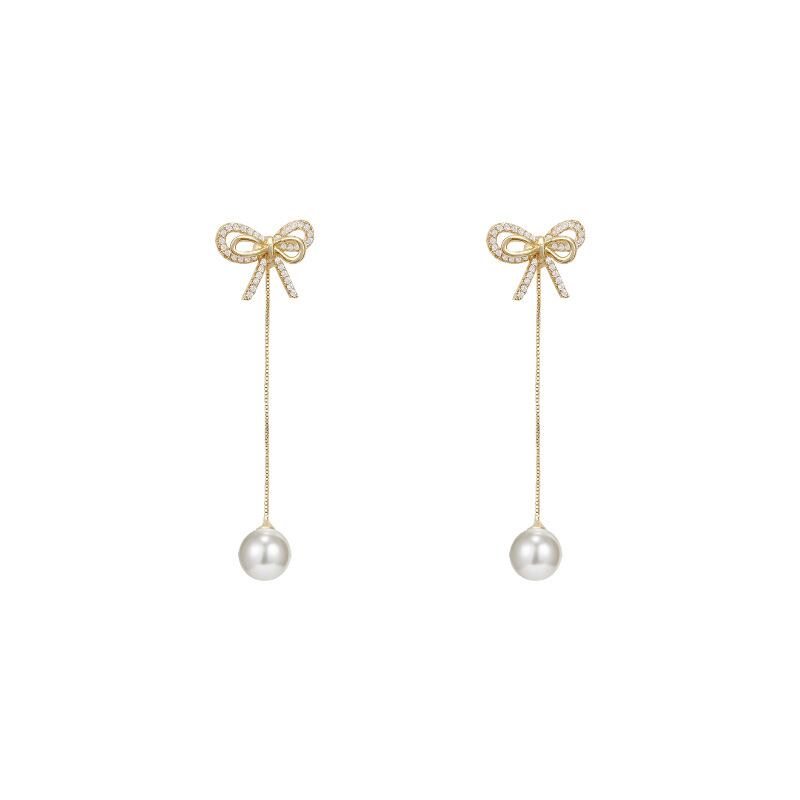 マイクロ象眼細工の蝶結びイヤリング、パールタッセルイヤリング、ロングイヤリングEHEEHE